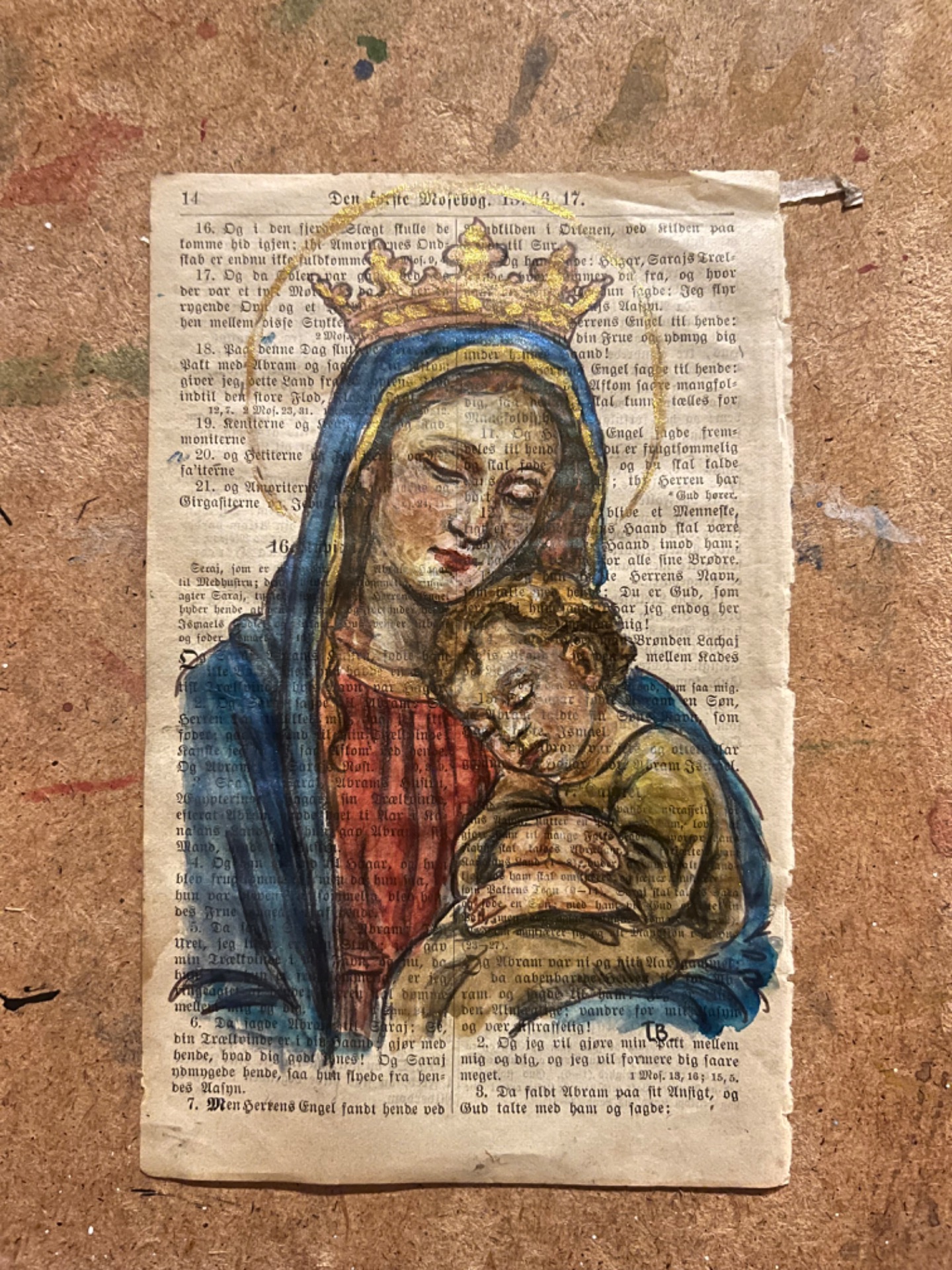 Bildet er måla på løvtynt papir frå ein gamal bibel frå 1895.
