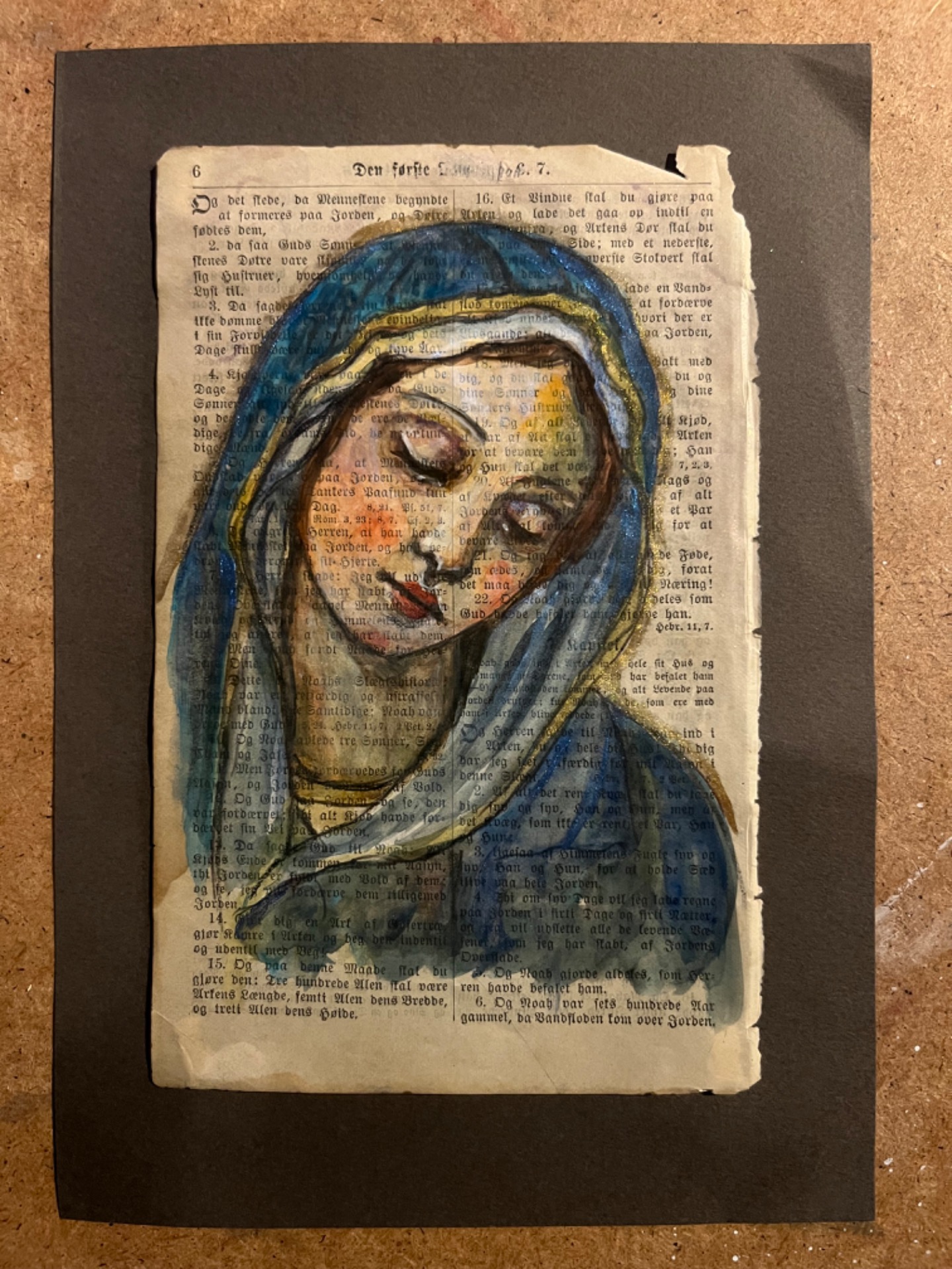 Bildet er måla på løvtynt papir frå ein gamal bibel frå 1895.